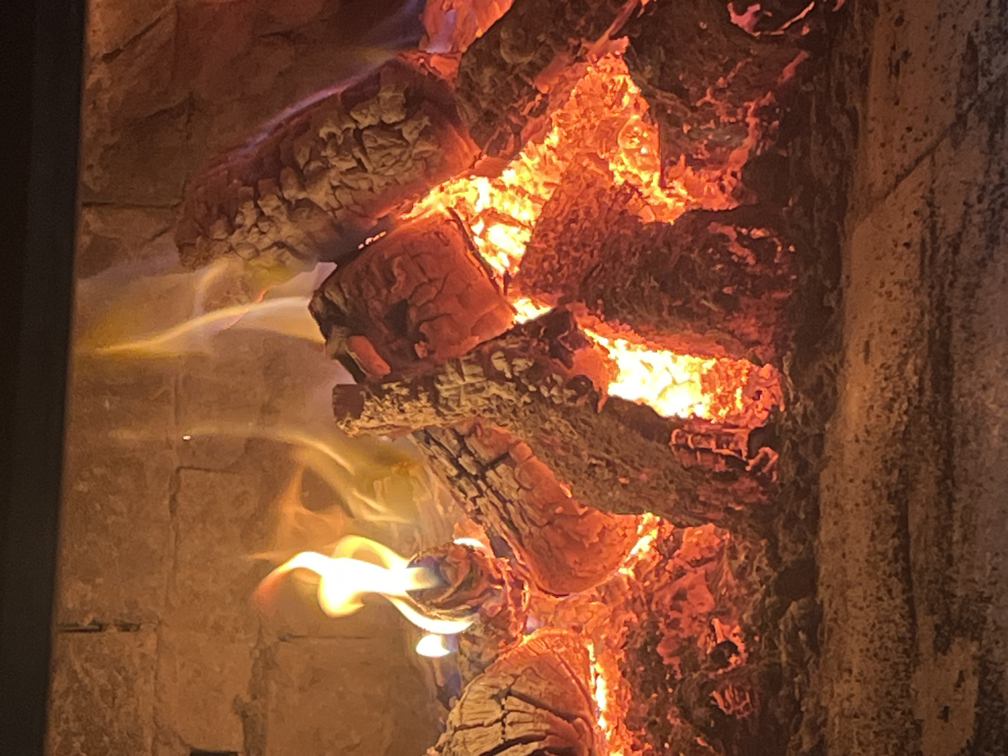 The image displays an active fire contained within an enclosed structure, consistent with a fireplace