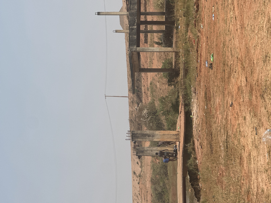 The scene is set in an arid, open environment in Kwang, Nigeria, under a pale blue, clear sky. The ground is reddish-brown earth, sparsely covered with dry grass and littered with various discarded items, including plastic bottles and bags. In the mid-ground, to the left, two upright concrete pillars, approximately 2-3 meters high, are positioned on a flat concrete slab. Visible at the base of this slab is a dark body of water or trench. Three dark-skinned individuals are present near these pillars. One individual, wearing dark shorts, is bent over an object on the slab, facing left. Another individual, also in dark shorts, stands upright with their back to the camera. A third individual stands to the immediate right of the second, facing left. To the right of the frame, a larger, unfinished concrete structure consists of multiple vertical pillars supporting a flat concrete roof section. This structure appears to be a skeletal framework of a building. The background features a low, undulating earthen embankment or hill extending horizontally across the frame. A wooden utility pole supporting multiple overhead power lines is visible on this embankment, projecting against the sky.