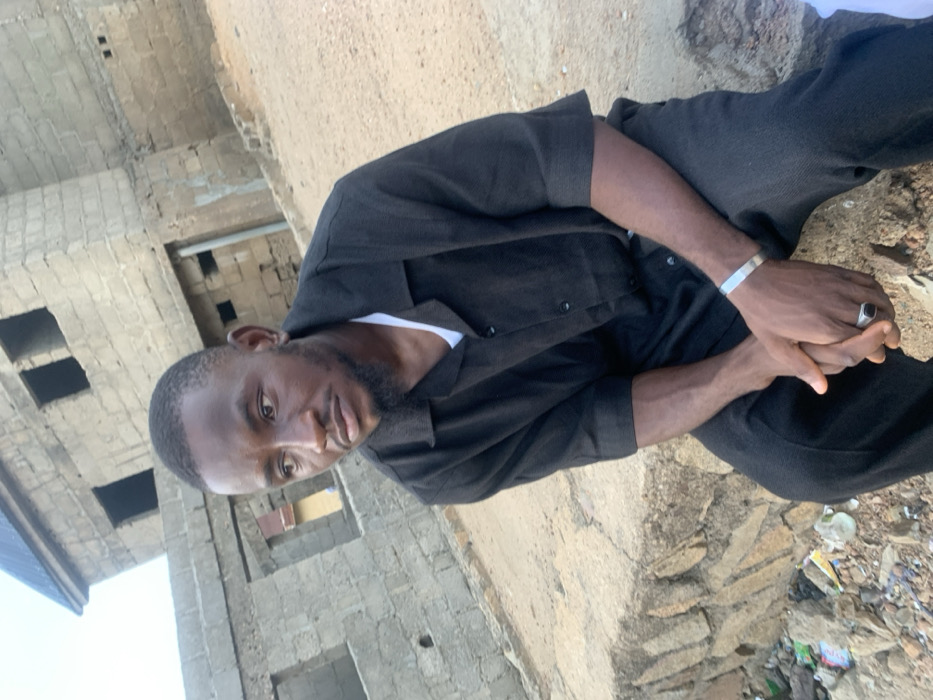 The image displays a young adult male, of dark complexion, seated outdoors in the city of Okene, Nigeria