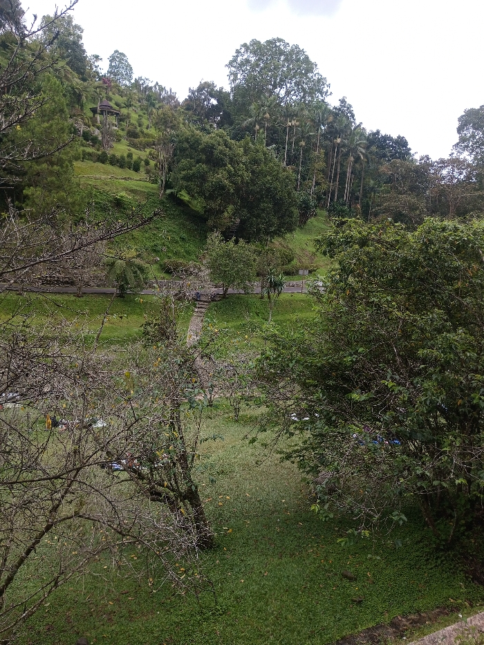 The scene depicts a verdant, hilly landscape in Kanand, India, under an overcast sky. In the foreground, dense green ground cover is visible, interspersed with several trees. One tree on the left features mostly bare branches with sparse yellow-green foliage. Another tree on the right displays full, dark green leaves. Partially obscured by the foreground foliage on the left are yellow-colored objects, while white and blue objects are partially visible on the right. The midground features a narrow, stone path leading upwards through the grass. A paved pathway runs horizontally across the scene, bordered by a light-colored fence or barrier on its far side. Two individuals are present on this paved pathway: one figure, dressed in dark clothing and light trousers, is walking from left to right; a second, less distinct figure is visible further to the left. The background consists of a steep, terraced hillside densely covered in green grass and a variety of trees, including prominent tall, slender trees resembling palms on the right side of the hill. A multi-sided gazebo with a dark roof and light-colored supports is situated on a terraced section of the hillside towards the upper left. The top of the hill is heavily forested. The sky is largely obscured by white and light grey clouds.