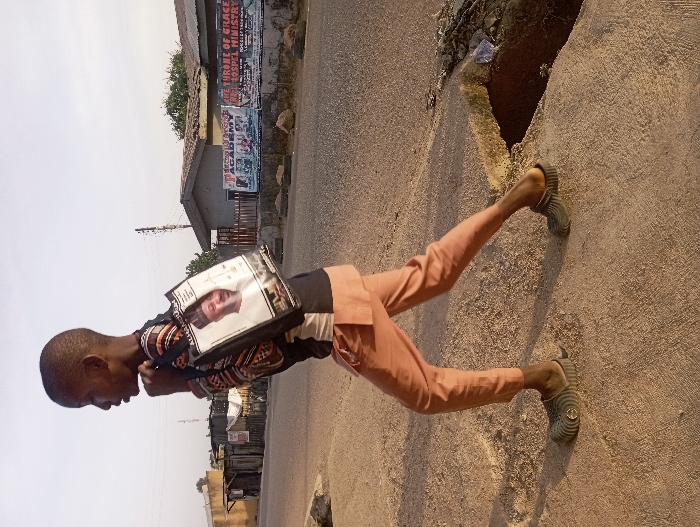 A young male, appearing to be between 8 and 14 years old, with short dark hair and a light brown complexion, is captured in a full-body, eye-level photograph walking on a light-colored, mixed dirt and concrete surface. He moves towards the left side of the frame, with his right leg extended forward. The subject wears a long-sleeved shirt with horizontal stripes in shades of brown and black over a lighter undershirt, light brown/tan trousers that are cropped above the ankles, and dark, textured slip-on shoes. He carries a black and white shoulder bag over his left shoulder; the bag displays a portrait of a man in traditional Nigerian attire with a beard and a smiling expression, alongside partial text "ALHAMDULIL..." and a "LAW" symbol incorporating a weighing scale. His left arm is bent at the elbow with a clenched fist; his right arm is not visible. Behind the subject is a paved road. Across the road, multiple single-story buildings with corrugated metal roofs are visible. On the right side, two large rectangular banners are affixed to a building's wall: one reads "TPI ACADEMY" and the other states "THE THRONE OF GRACE DIVINE GOSPEL MINISTRY" with additional text "TO ACCEPT JESUS AS LORD." Utility poles and sparse trees are present in the distant background. The sky is clear and bright. A concrete gutter with an open section is visible in the lower right foreground. The setting depicts a street scene in Jos, Nigeria.