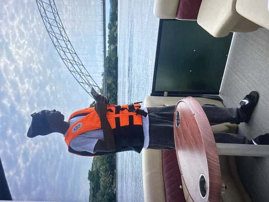 A man wearing a life vest stands on a boat, looking at his phone. In the background is a suspension bridge spanning a body of water. The boat's interior includes seating and what appears to be a small table or bar. The man is wearing dark pants, a white t-shirt, and a dark baseball cap. He also has on black slides. The weather appears to be overcast.