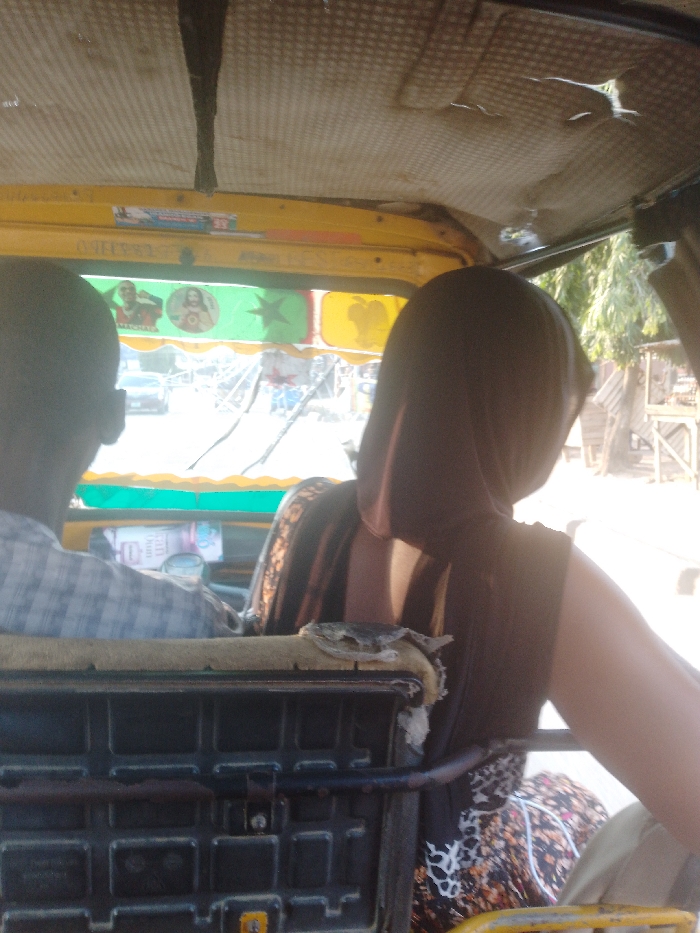 The image presents an interior view from a yellow commercial tricycle, commonly known as a Keke Napep, consistent with transport vehicles found in Lagos, Nigeria