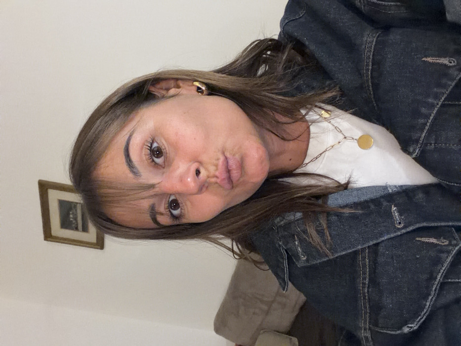 A woman poses indoors, wearing a dark denim jacket over a white shirt and a gold necklace with circular pendants. Her brown hair is styled with bangs, and she is wearing gold hoop earrings. A framed picture hangs on the wall behind her. She has brown eyes, defined eyebrows, and is pouting her lips towards the camera. A beige couch is partially visible in the background. The image is rotated slightly.