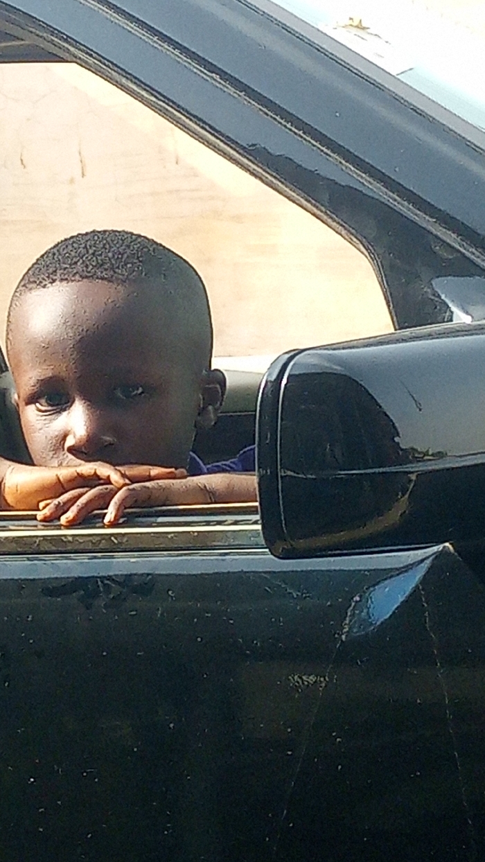 A young, dark-skinned child, likely male, with closely cropped black hair, is depicted from the chest up, leaning out of the open window of a dark-colored vehicle