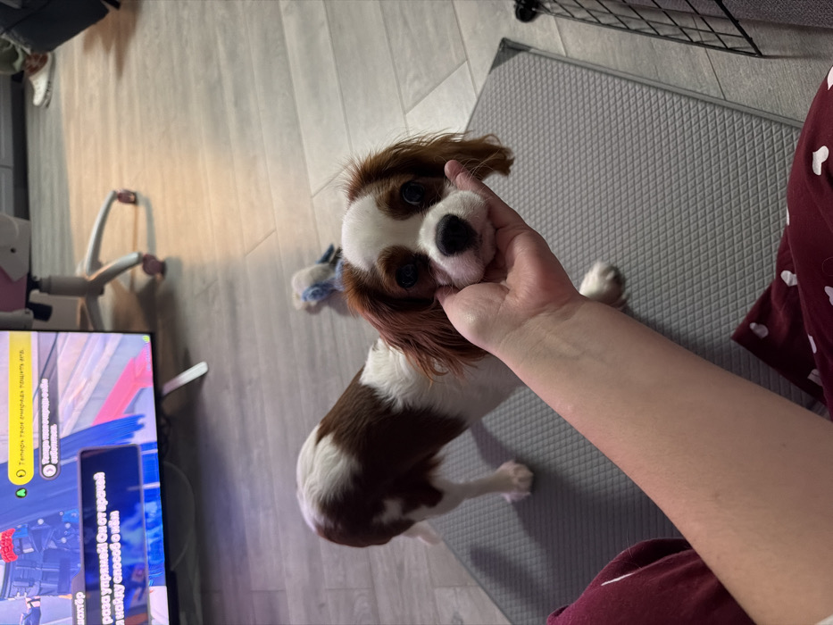 A Cavalier King Charles Spaniel with brown and white fur is being affectionately held by a person's hand. The dog is on a gray surface, possibly a mat. To the left, a television screen displays text in Russian. The background includes a workout machine and part of a wire shelf. The person's arm extends into the frame, and their clothing is visible in the bottom right corner.