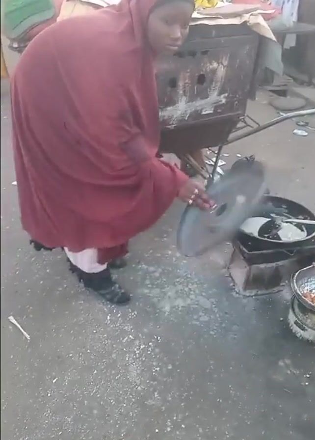 A woman in a maroon hijab is cooking outdoors. She is using a large, black frying pan set on top of a small, brick stove. She uses a spatula to stir something in the pan. Beside her is a colander containing fried dough. Behind her is a rusty wheelbarrow filled with various items. The scene is on an asphalt street, which appears to be in a busy, outdoor market area.