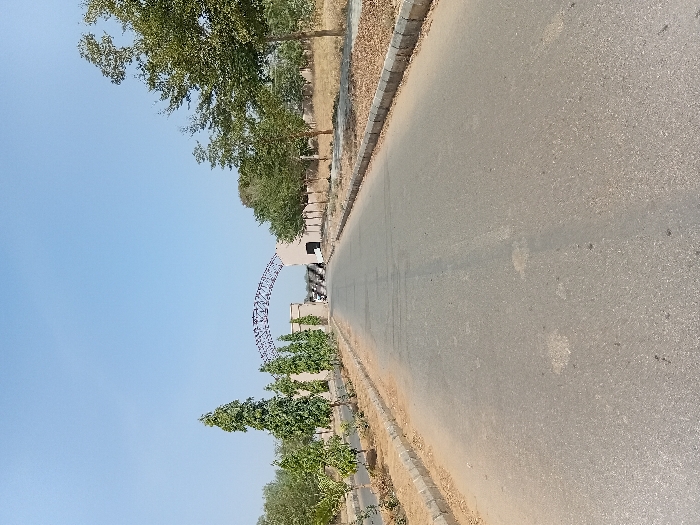 The scene depicts an asphalt-paved road extending towards a prominent gate structure under a clear blue sky in Ayama, Nigeria. The road, appearing grey and generally flat, is bordered on both sides by concrete curbs. Beyond the curbs, narrow dirt strips run parallel to the road. On the left side of the road, a uniform row of tall, slender evergreen trees with dark green foliage is planted along the dirt strip. Further left, sparse smaller trees and shrubs are visible in a less manicured area. On the right side, a row of deciduous trees with lighter green leaves lines the road. Beyond these trees, the terrain consists of dry, yellowish-brown grass and sparse vegetation, indicative of a drier environment. In the mid-ground, the road culminates at a gate complex. This complex features two light-colored, rectangular gate posts or small buildings flanking the road. Spanning the gap between these structures is a dark, arched metal truss, forming an overhead archway. Beyond the gate, indistinct shapes of vehicles or individuals are faintly discernible, passing through the entrance. No clear human figures or specific actions are prominently visible in the foreground or mid-ground. The sky above is devoid of clouds.