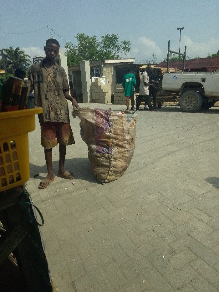 The image depicts an outdoor scene in Badore, Nigeria, under a bright, partially cloudy sky. The ground is paved with light-colored concrete interlocking blocks, showing some scattered debris. In the foreground, to the left, a portion of a yellow plastic basket containing multiple dark objects (possibly cans) is visible. A dark green strap hangs beneath it. In the midground, a young male individual stands upright, facing forward, slightly turned towards the camera. He wears a light-colored, patterned short-sleeved button-up shirt (with visible "DIOR" text), reddish-brown shorts with lighter brown accents, and light brown slip-on sandals. His right arm is extended downwards, resting near a large, full, cylindrical sack made of coarse, light brown material, which stands upright on the pavement. The sack features colorful striped patterns around its middle. In the background, multiple structures and individuals are present. To the left of the background, green foliage from trees and bushes is visible. A building constructed from concrete blocks, with additional blocks stacked nearby, stands behind the main subject. Further to the right, three individuals are partially visible. One person wears a bright green t-shirt and shorts, facing away from the camera. Another person in a light-colored t-shirt and dark pants stands near a third, darker-clad individual, positioned next to a white pickup truck. The truck, viewed from the side, has a visible rear wheel and a metal frame or rack in its bed, which appears to hold dark, possibly wooden, materials. A pole-mounted lamp fixture is visible above and behind the truck.