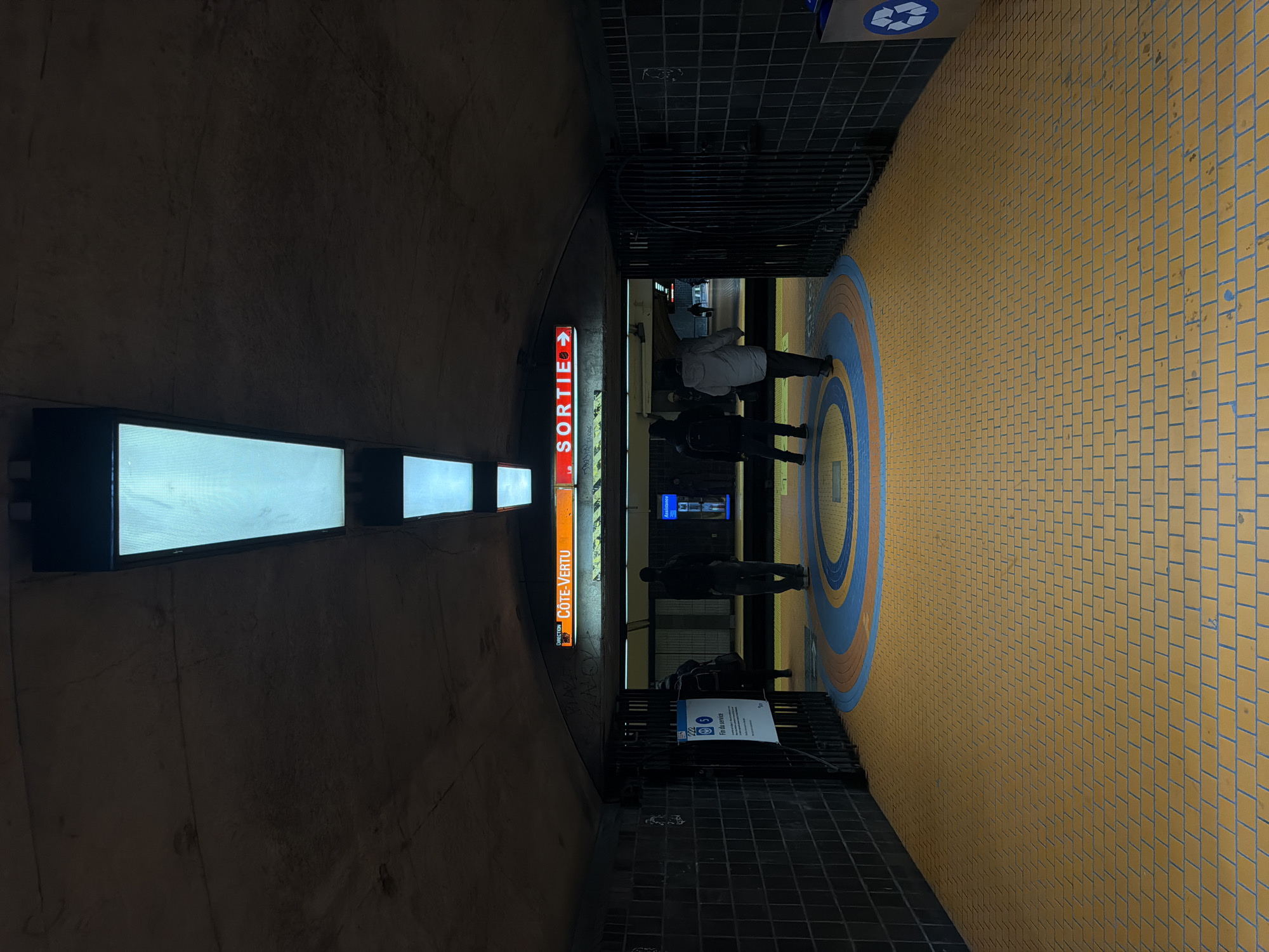 The image depicts a metro station in Montreal, Canada. Several people are waiting on the platform, which is tiled in a yellow brick pattern with blue grout. Concentric circles of blue and orange are painted on the platform near the edge. Signage indicates "Sortie" (Exit) with an arrow, and "Côte-Vertu" in the direction of a metro line. The area leading to the platform has a low ceiling and is dimly lit by rectangular light panels. A recycling bin is visible. The environment is urban, public, and functional, consistent with a subway station.