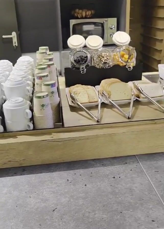 breakfast buffet station in what appears to be a hotel or similar establishment. The station is made of light-colored wood and features several shelves. On the top shelf is a black bowl with apples inside, as well as a microwave. The main counter of the station features rows of stacked white mugs, paper cups, jars filled with toppings like dried fruit and nuts, and platters of sliced white bread with tongs. To the right, there are containers of cheese, ham, and small yogurt cups. The floor is a gray tile. There are no people visible in the video. The camera pans slowly to the right.