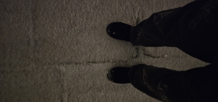 view looking down on a pair of feet wearing dark shoes or boots standing on a snow-covered surface, possibly a sidewalk or road. The snow appears uneven and lightly tracked, suggesting recent snowfall. The person is wearing dark pants, and the lighting is dim, possibly indicating that the picture was taken during the night.