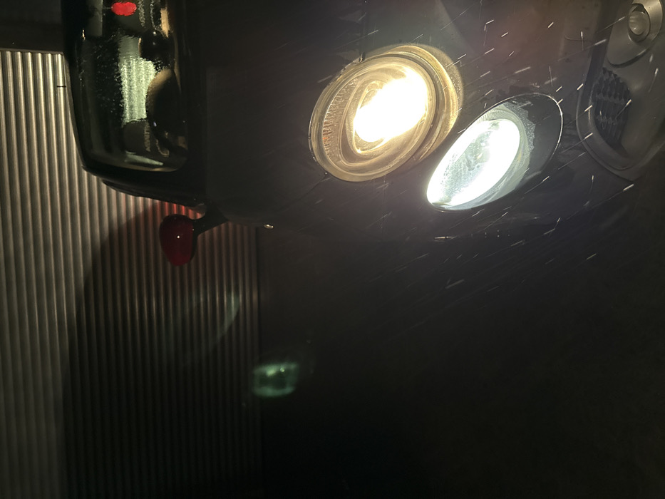 The image depicts the front-right quarter of a dark-colored compact vehicle, possibly a Fiat 500, positioned in what appears to be a parking area or driveway in Epping Forest, United Kingdom, during nighttime or heavily overcast conditions. The vehicle's main right headlight emits a warm, yellowish-orange light, while a smaller, oval auxiliary light below it emits a cool, white light. The vehicle's surface, particularly the hood and headlight casings, is visibly wet with numerous illuminated water droplets or snowflakes, suggesting precipitation. The right side mirror is a prominent red. Through the windshield, faint outlines of interior elements are discernible, including a light-colored object, possibly a headrest or seat. The background consists of a dark, horizontally ribbed surface, characteristic of a garage door or roller shutter, reflecting some light. The ground in the foreground is dark, and a faint, blurred green light source or reflection is visible on the ground surface towards the left in the background. No individuals are visible.