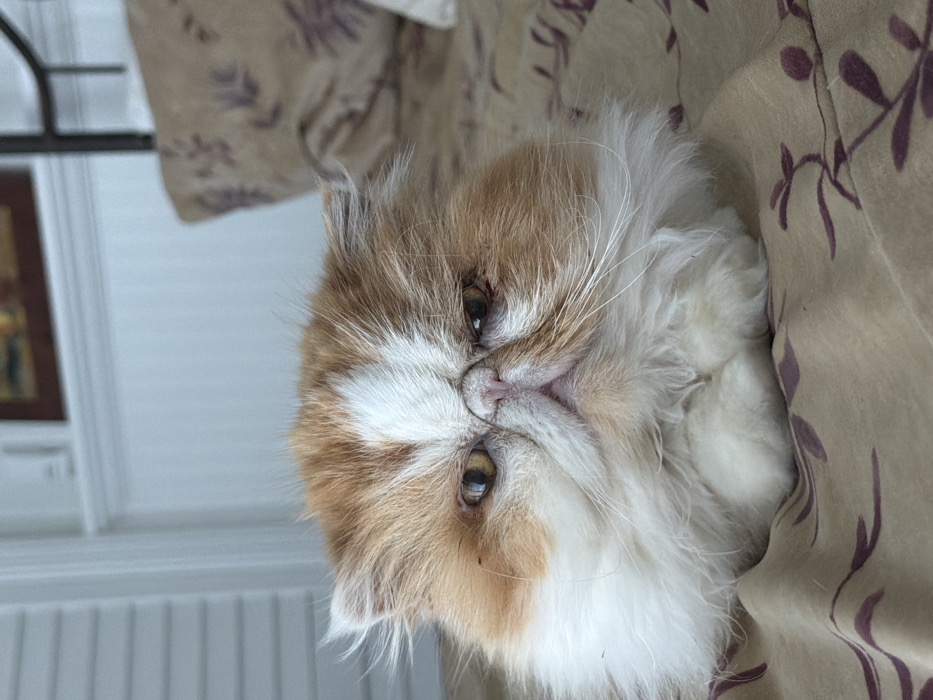 - "A bicolored Persian cat with orange and white fur is depicted lying indoors on a patterned bedspread in Rancho Palos Verdes, United States of America" by FM-RpOXy1, licensed under CC BY 4.0