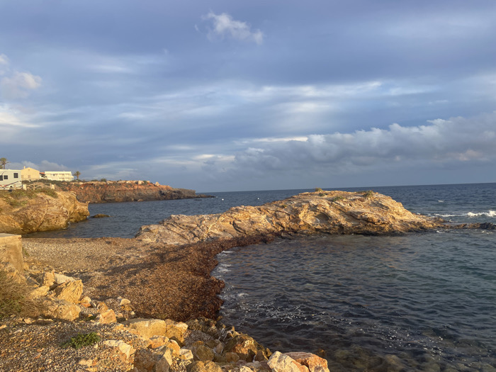 The image depicts a coastal scene in Cabo De Palos, Spain, characterized by rocky formations, a marine environment, and a partly cloudy sky. In the foreground, golden-brown rocks line a small cove. This cove features a gravel beach heavily covered with a dense accumulation of dark brown seaweed. To the right, clear, dark blue water shows small ripples. A prominent rocky islet, illuminated by low-angle sunlight, rises from the water in the mid-ground, supporting minimal green vegetation on its peak. To the left, a reddish-brown cliff face forms part of the coastline, extending into the bay. Above this cliff, multiple white-walled buildings with flat roofs are visible, interspersed with sparse green vegetation and palm trees. The background consists of the open sea under a sky with scattered white and gray cumulus clouds, indicating a partially overcast condition with visible blue sky. No individuals or active subjects are present.