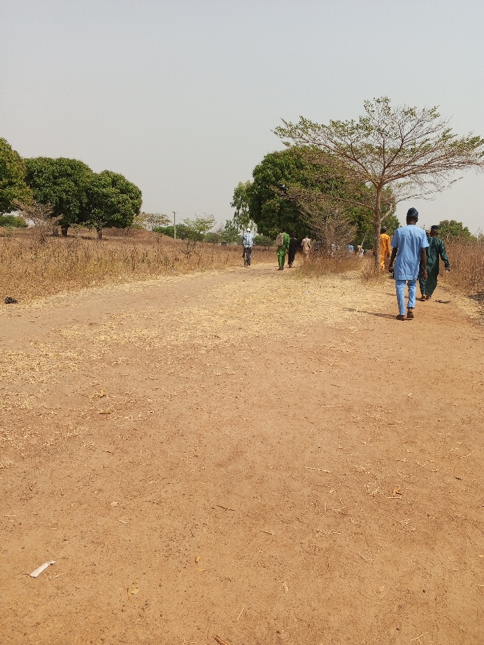 - "The image depicts a wide, unpaved reddish-brown dirt path extending into a dry, semi-arid landscape under a pale, hazy sky in Unknown, Nigeria" by FM-f9W8F3, licensed under CC BY 4.0