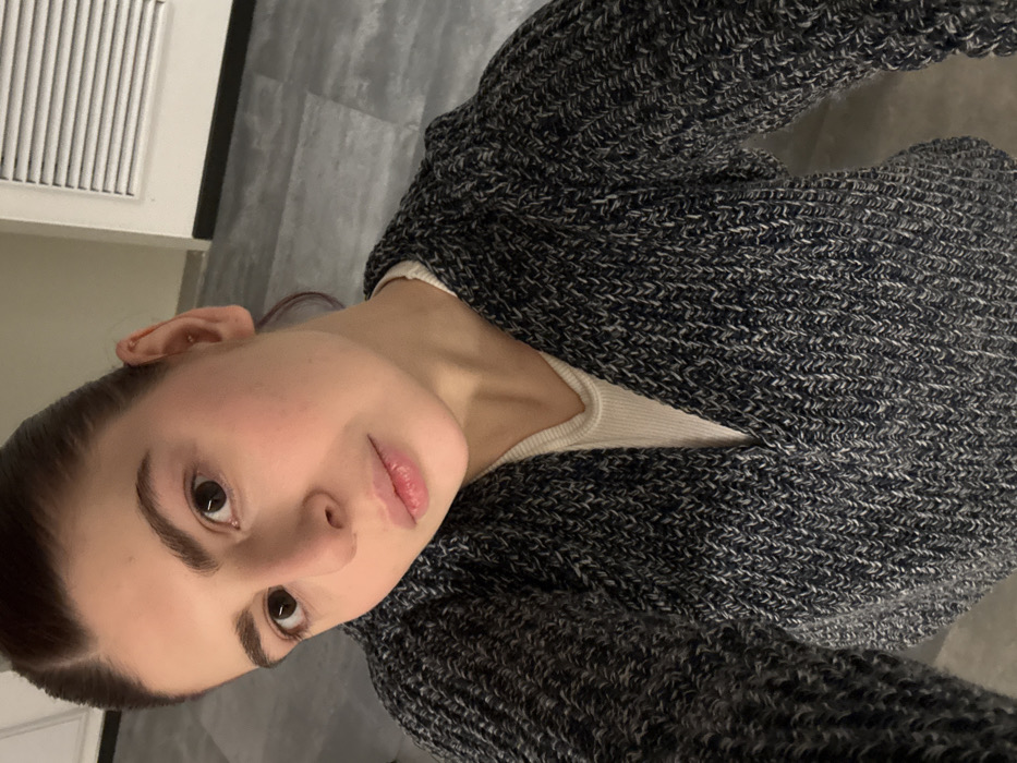A forensic description of the image reveals a single individual, appearing to be a young adult female, captured in a selfie-style, angled, close-up photograph within an indoor setting in the city of Unknown, Unknown. The individual, with dark hair pulled back, brown eyes, and light skin, is seen looking directly at the camera with a neutral expression. She wears a ribbed white undershirt beneath an open, dark grey and white flecked, chunky knit cardigan with a distinct chevron-like pattern. A small helix piercing is visible on her right ear. The background features a grey, possibly tiled floor, and a light-colored wall or door with horizontal louvered detailing in the upper right.