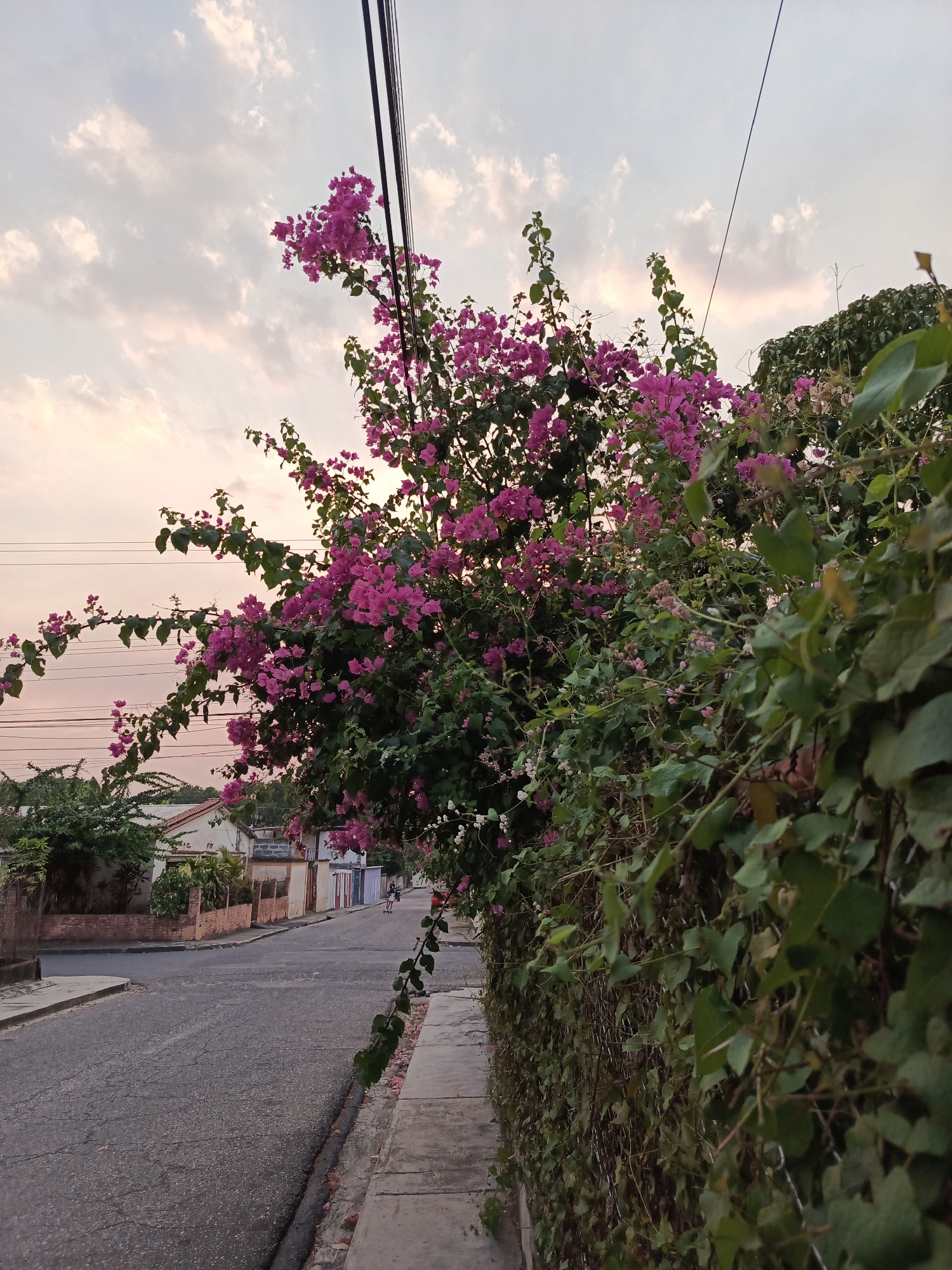 The image depicts a residential street scene in Tinaco, Venezuela, during twilight hours, evidenced by the pale orange and pink hues in the upper sky with scattered white clouds. The foreground on the right is dominated by a large bougainvillea bush with vibrant magenta flowers and green foliage, obscuring a chain-link fence heavily overgrown with green vines and leaves. A concrete sidewalk runs parallel to this vegetation. An asphalt road, exhibiting surface cracks, extends from the lower left into the background. On the left side of the road, another concrete sidewalk precedes various single-story residential buildings of diverse architectural styles, including structures with terracotta-tiled roofs and others with flat roofs. Green trees and shrubbery are interspersed among the residences. Overhead power lines are visible against the sky. In the mid-ground, a lone individual is observed riding a skateboard-like device away from the viewer on the asphalt road. The individual is wearing light-colored clothing, consisting of what appears to be a white top and dark lower garment.