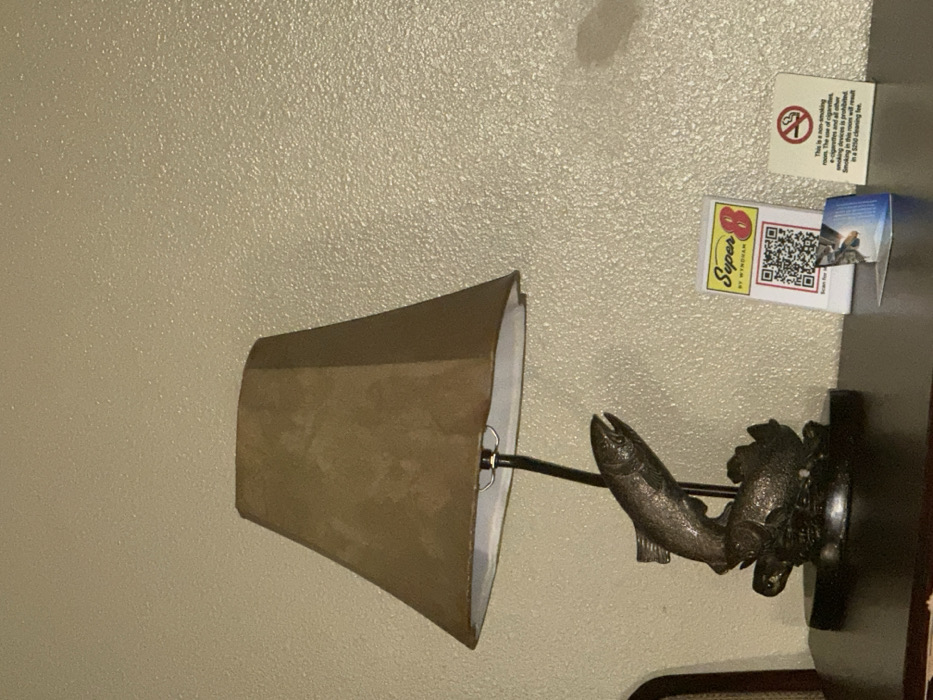A brown lamp with a fabric lampshade sits on a dark brown surface against a tan wall. The lamp's base features a decorative fish sculpture. Behind the lamp on the wall, there's a "no smoking" sign, a Super 8 by Wyndham advertisement with a QR code, and a small, blue-and-white informational card or brochure.
