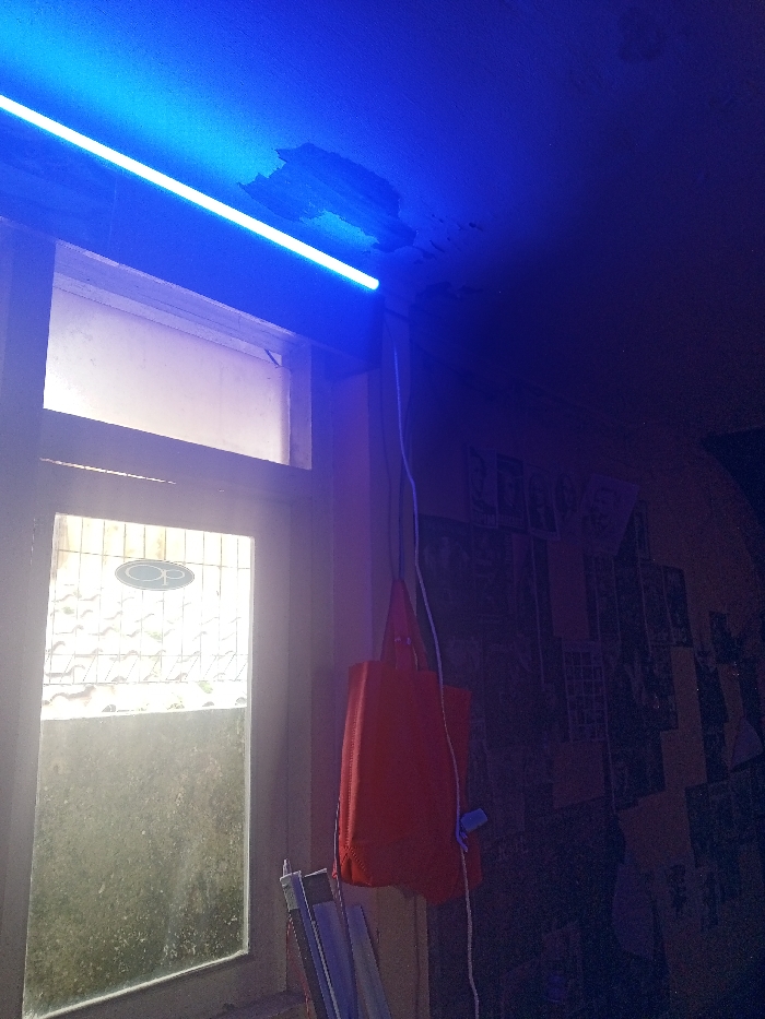 A dimly lit room features a grimy window with an "OP" sticker. A vibrant blue light fixture illuminates a section of the ceiling marred by what appears to be water damage. An orange tote bag hangs near the window, adjacent to a white power cord. The wall is adorned with a collage of photographs or posters, partially obscured by the darkness. The overall atmosphere is slightly dilapidated.