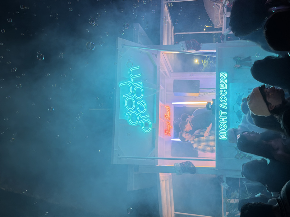 A brightly lit, stylized structure stands amidst a hazy, bubble-filled atmosphere. A neon sign reads "Dream Beach" in cyan. Inside, under neon lighting, are two men in an embrace. A second sign beside the doorway says "Night Access". People stand around, blurred in the foreground, appearing to observe the scene within. The whole image gives a festive and celebratory vibe.