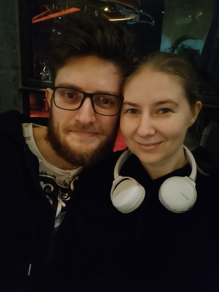 A selfie captures a man and a woman indoors. The man, on the left, wears glasses and has a beard. The woman, on the right, has white headphones around her neck. They are close together, both smiling slightly. The lighting is dim, with hints of red glow behind them. The man wears a white shirt under a black hoodie, while the woman is in a black sweater. A window is visible behind them.