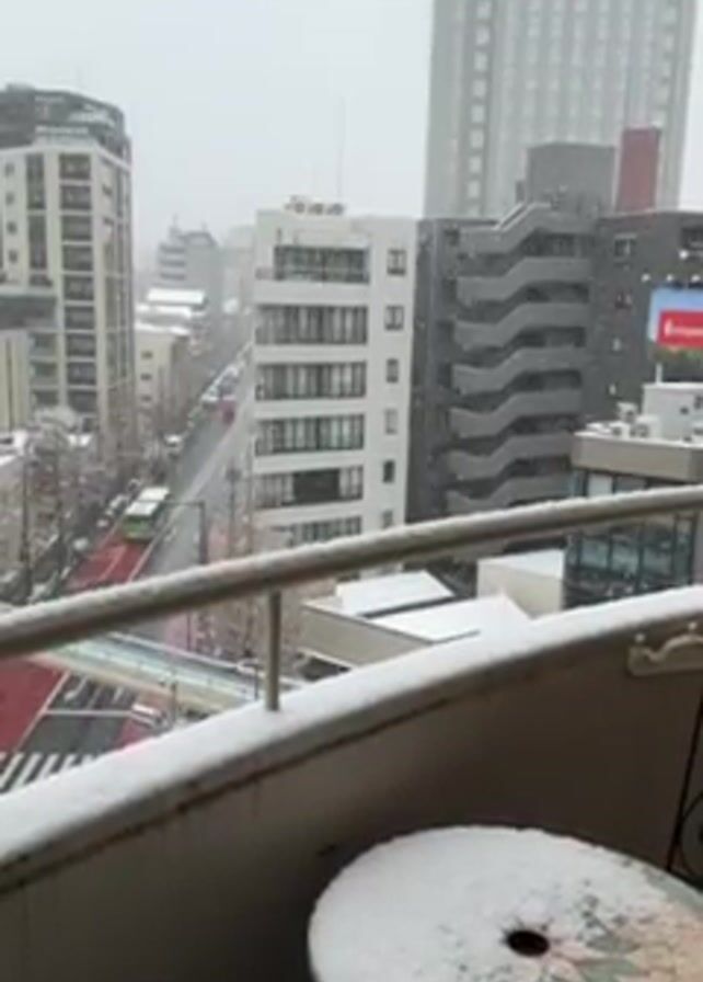 The scene is a high-angle view from a balcony overlooking a snowy urban landscape