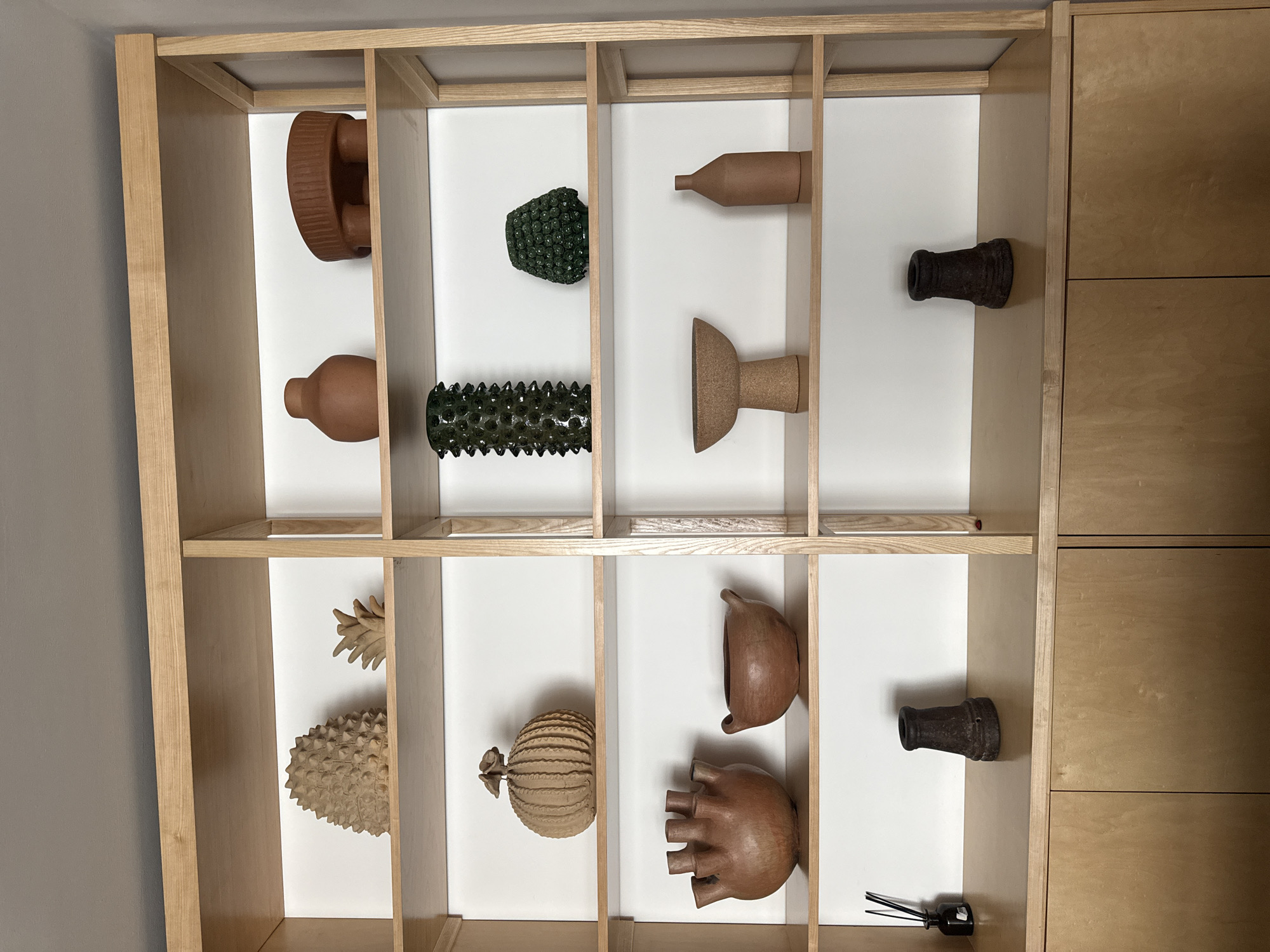 The image depicts a light wood shelving unit with white back panels, filled with decorative pottery and ceramic objects