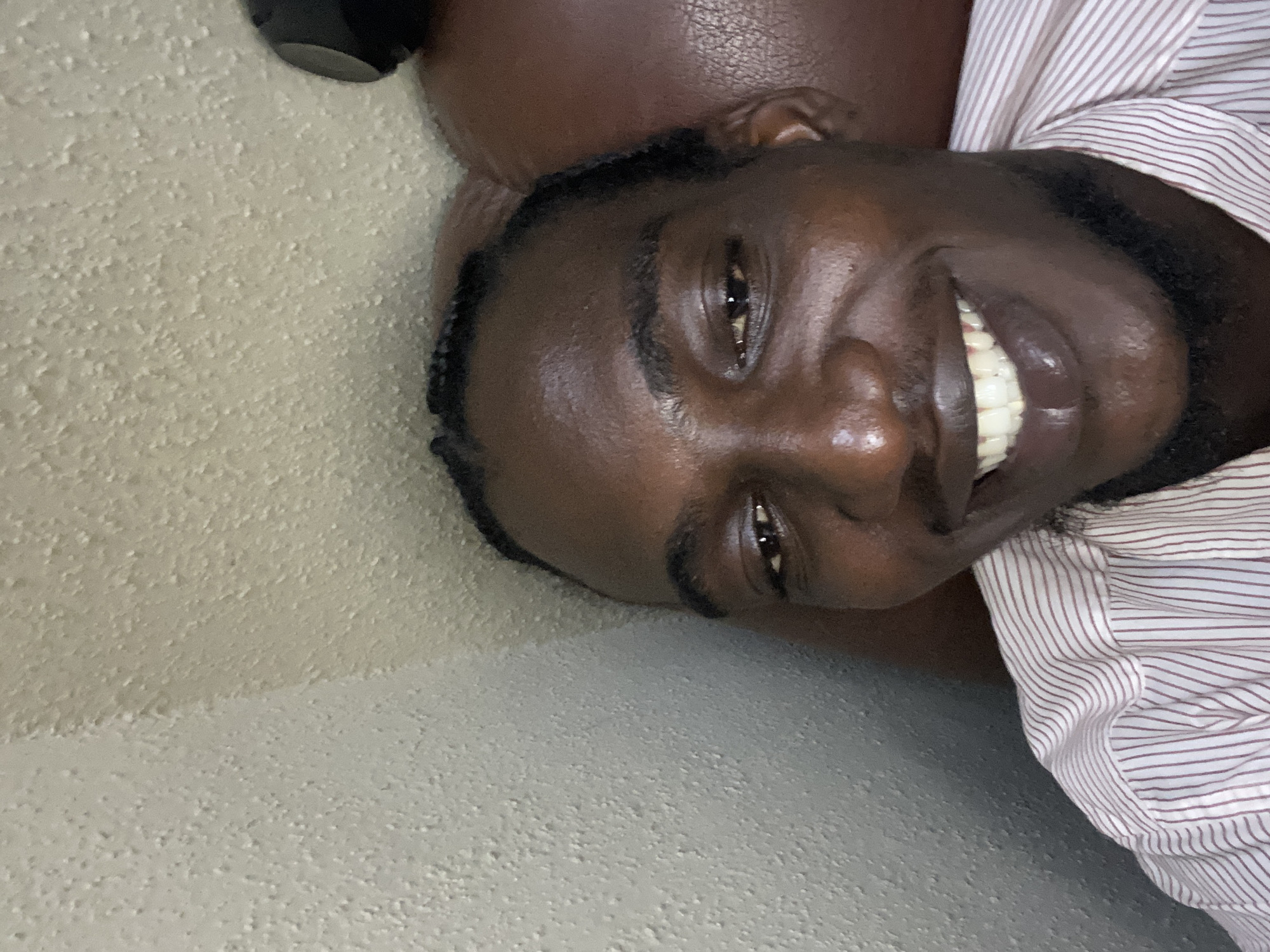 A dark-skinned man with braided hair is lying on his side. He is smiling and wearing a striped shirt. He is indoors against a light-colored textured wall. There is a dark object in the upper left corner of the frame. The location in Lagos, Nigeria, is not discernible from the image.