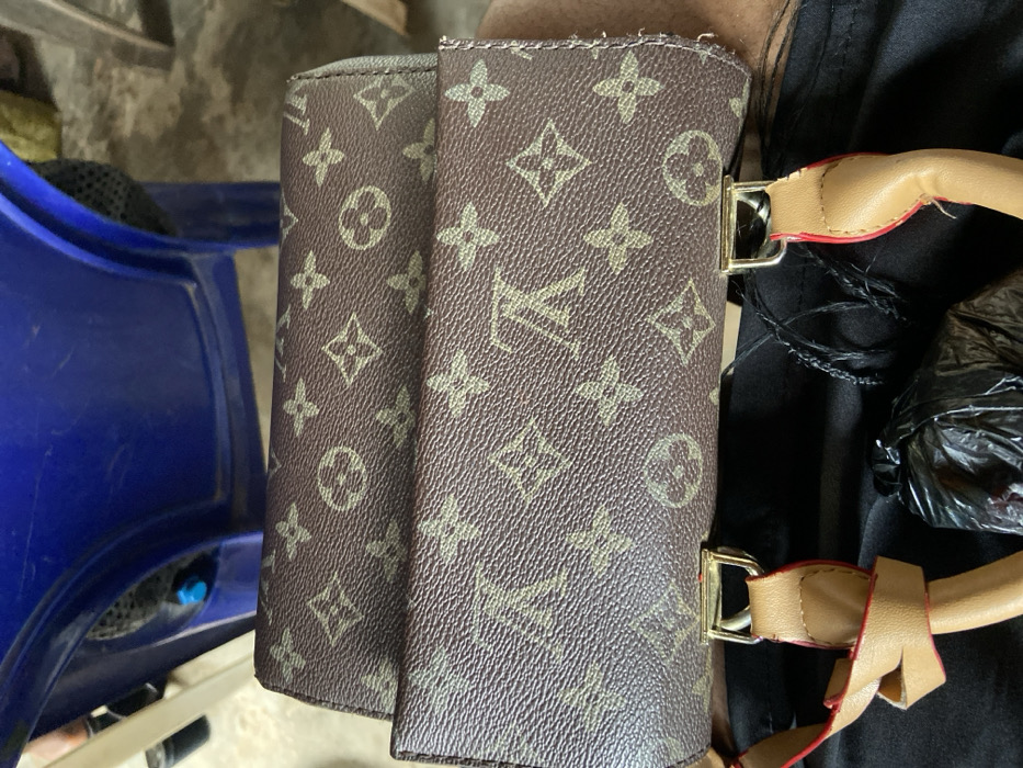 The scene, documented in Ojoto, Nigeria, features two brown items adorned with a repeating pattern of light beige Louis Vuitton monograms
