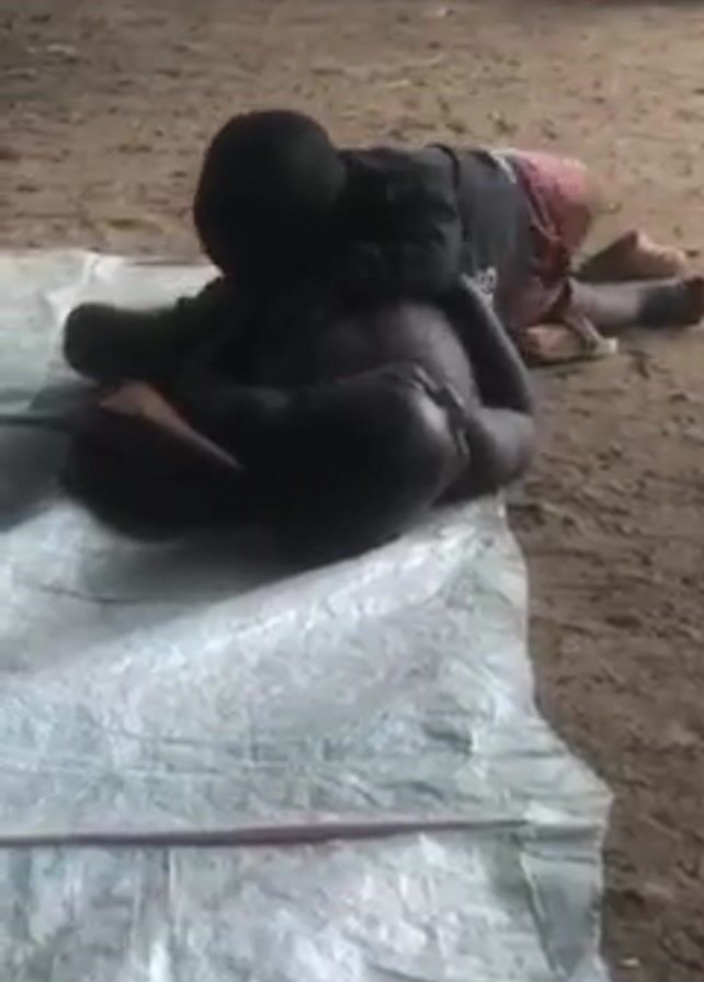 A video shows two children playing on a tarp on a dirt ground. One child, wearing a black shirt and red shorts, is on top of the other child, who is shirtless and lying on their back. The child on top appears to be playing with the other child's hands. In the background, there is a white speaker and other people standing around. There are also piles of debris and tree roots visible in the background.