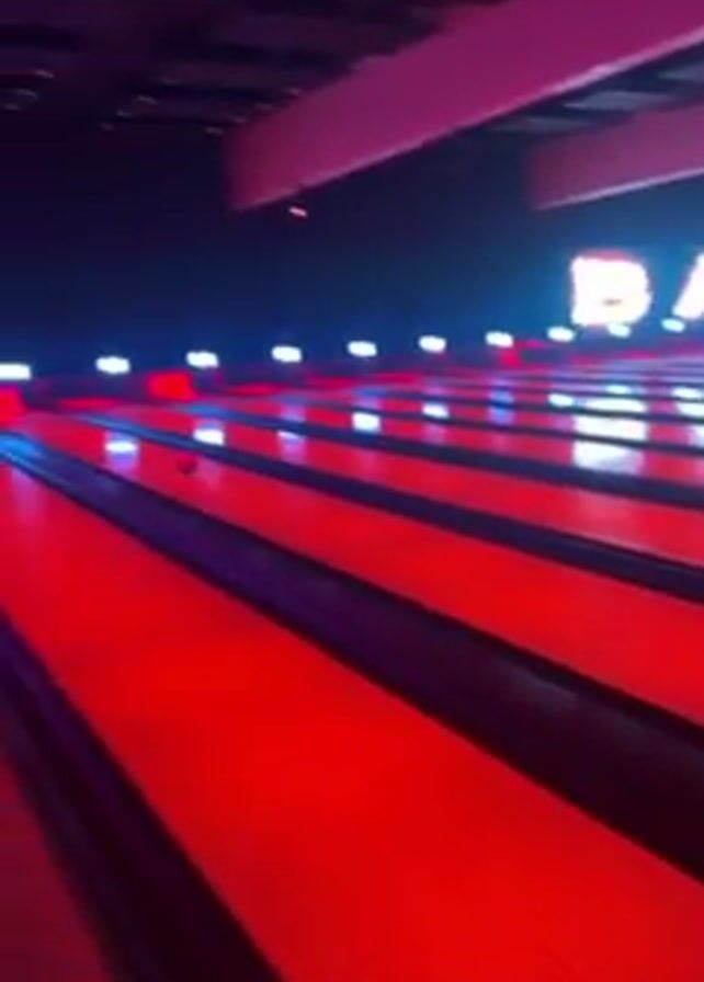 bowling alley with lanes lit up with red and blue neon lights