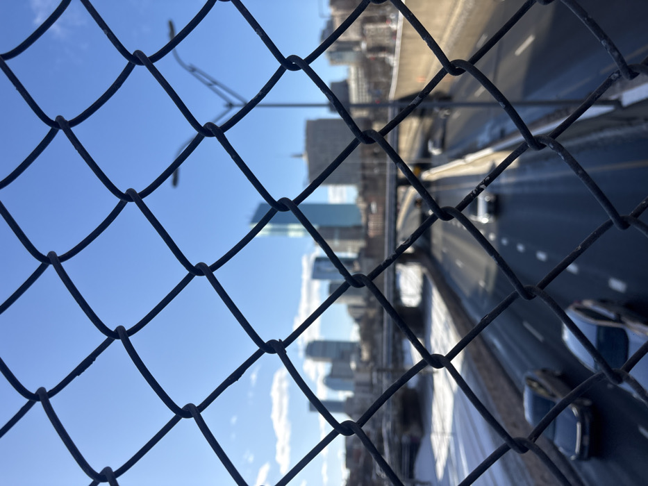 - "The image displays an overhead perspective of the Massachusetts Turnpike (I-90) in Boston, Massachusetts, United States of America, viewed through the diamond mesh of a dark, sharply-focused chain-link fence in the immediate foreground" by FM-lLLLi1, licensed under CC BY 4.0