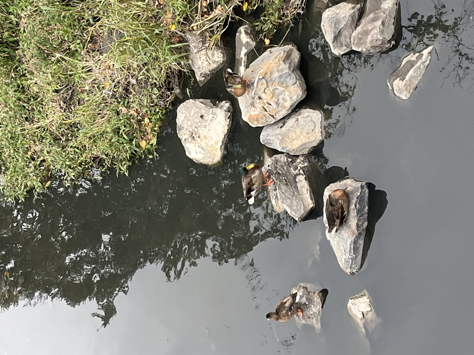 This image presents a detailed view of a section of a canal or pond located in Croix, France. The scene features dark, still water reflecting the silhouette of an overhead tree. Along the right edge, a bank is densely covered with green and brown vegetation, including fallen leaves. Several irregularly shaped rocks, primarily in shades of gray and brown, are dispersed within the water and along the bank. Four ducks are visible: one male Mallard, identified by its green head and brown body, stands on a rock near the center-right; another brown duck stands on a rock further to the left. Two additional brown ducks are resting, each with its head tucked into its back, on separate rocks in the foreground-center and mid-right. The ducks are stationary on the rocks.