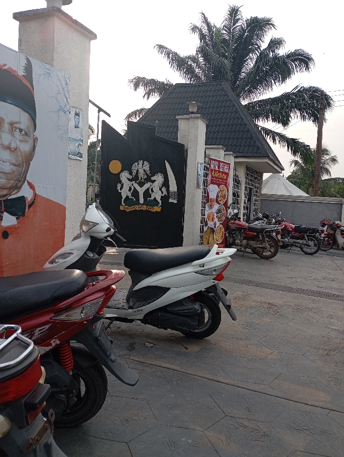 A gate with the Nigerian coat of arms displays "Royal Bethel Kitchen" beside a pillar adorned with a portrait. Parked scooters and motorcycles clutter the foreground on a patterned pavement. Beyond the gate, a dark-roofed structure stands, partially obscured by palm trees. The sky is overcast.