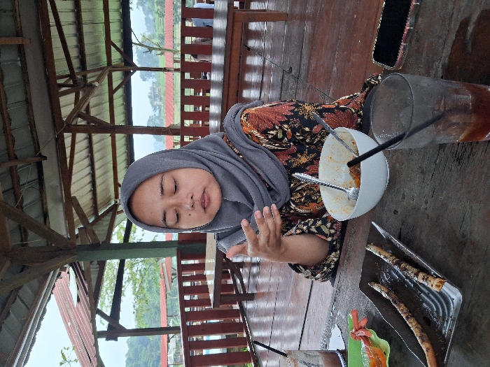 A woman in a gray hijab and patterned dress sits at a wooden table with a bowl of food, a glass of dark liquid with a straw, and a plate of grilled food. Her hand is raised near her face. A smartphone rests nearby. The table is under a wooden structure with a view of greenery and buildings in the background.