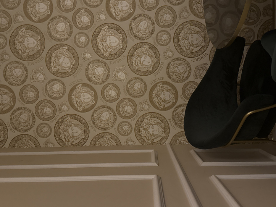 A close-up shot displays a wall adorned with a Versace-patterned wallpaper, featuring stylized Medusa heads encircled by the brand name