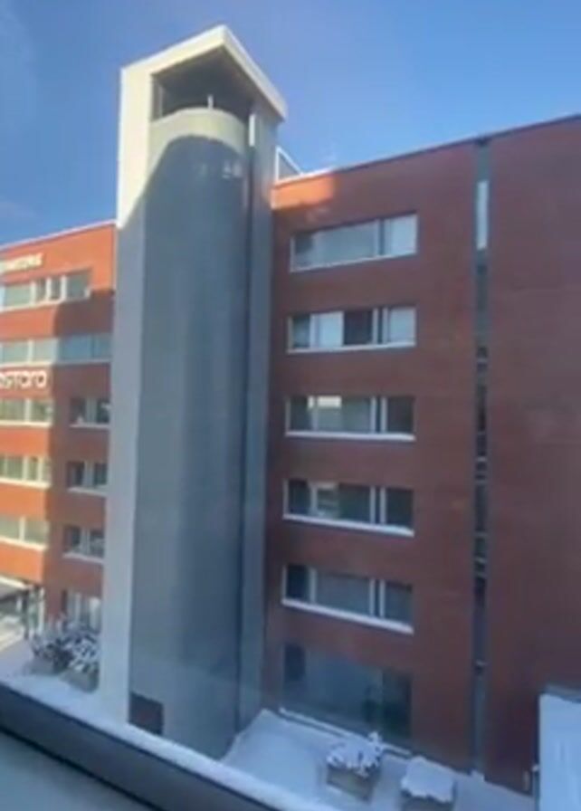 view from a window on a sunny day with snow on the ground. Initially, the view is of a brick building with a gray, cylindrical element attached. The building has the words "SAMSUNG" and "ASTARA" on it. The camera then pans to the right, showing a parking lot covered in snow with cars parked in it. In the background, there is a building with the word "TECHNOPOLIS" on it and trees. The sky is a clear blue. The window has a snowflake decoration on it.