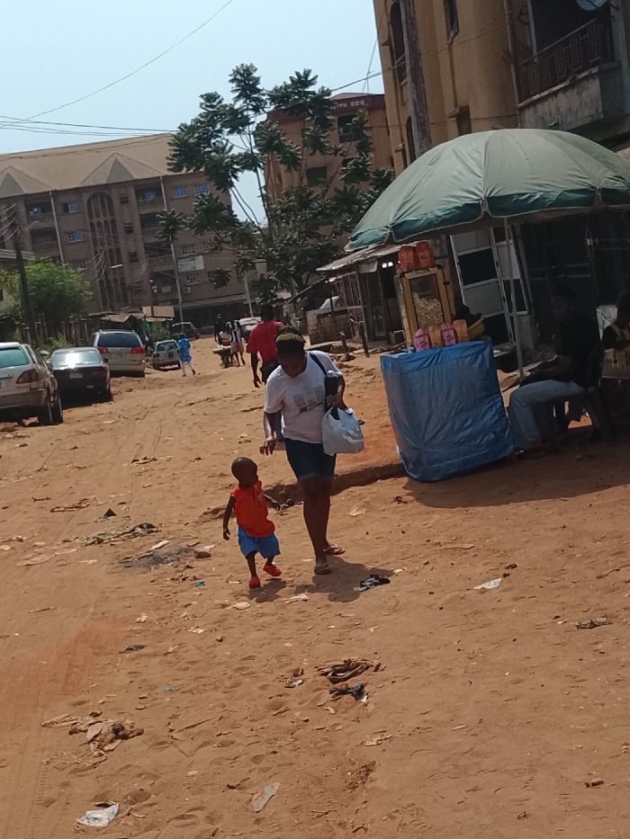 The scene depicts a bustling, unpaved dirt road environment within the city of Onitsha, Nigeria, under clear, bright daylight. The ground is reddish-brown earth, uneven, and significantly littered with various debris including plastic, paper, and organic matter. In the mid-ground, slightly to the left of center, an adult female with dark skin walks right-to-left, looking down and slightly ahead. She wears a white short-sleeved t-shirt with a graphic, dark shorts, and light-colored flip-flops. Her hair is in short braids or twists. In her left hand, she carries a light-colored plastic bag. To her immediate left and slightly ahead, a young child, appearing to be a toddler, walks in the same direction. The child has dark skin and wears an orange short-sleeved t-shirt, blue shorts, and red shoes. The child looks towards the left. To the right of the adult and child, a makeshift vendor stall is set up. It features a large, light green umbrella providing shade. Below the umbrella, a small glass display case sits on a surface, containing various packaged snacks, identifiable by colorful wrappers (e.g., orange, pink, white). Below this, a large object covered in blue tarp is present. Adjacent to the stall, to its right, a man with dark skin is seated, wearing a dark t-shirt and light-colored trousers. Another individual is partially visible behind him. In the background, on the left side of the frame, several parked or slowly moving vehicles are visible on the unpaved road. The closest is a light-colored sedan. Further back, multiple-story buildings with various architectural styles are present, interspersed with green trees. One prominent building has a sloped roof and several windows. The sky overhead is a clear, light blue.