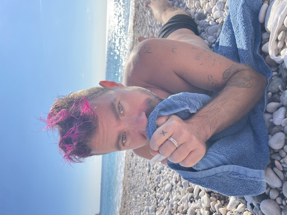 A male subject with short pink-dyed hair on top, darker sides, a beard, and blue eyes is observed lying prone on a pebble beach