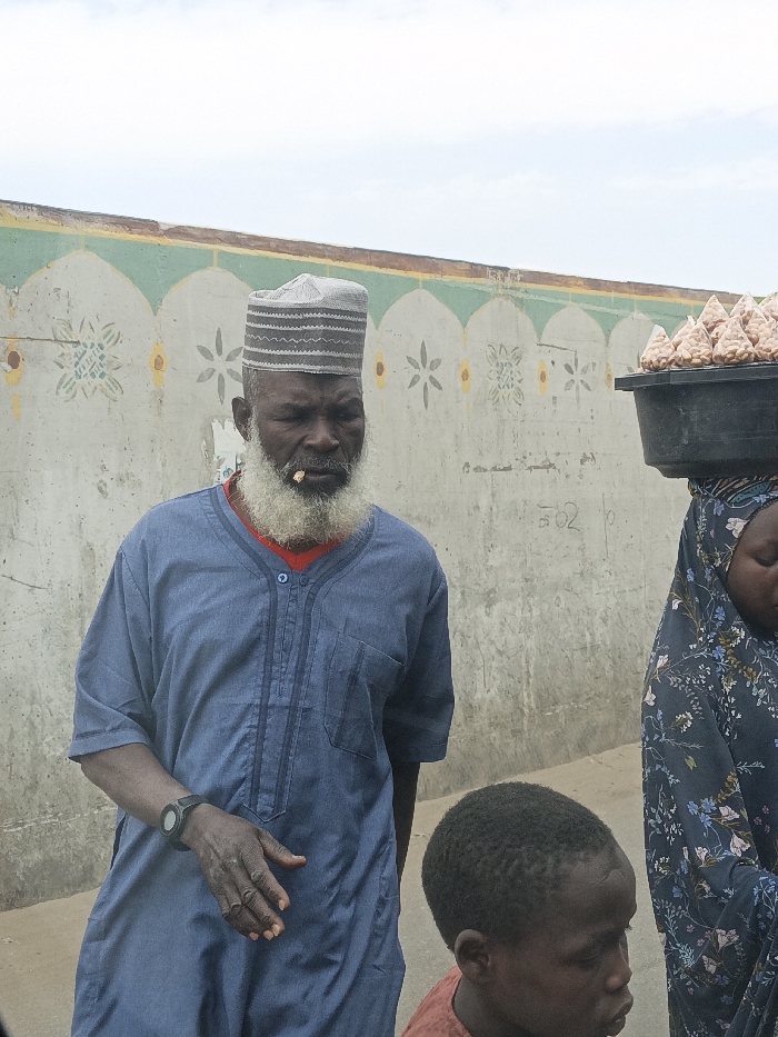 In Fagge C, Nigeria, an elderly man with a prominent white beard and a grey and white striped cap stands facing slightly right, a small light-colored object in his mouth