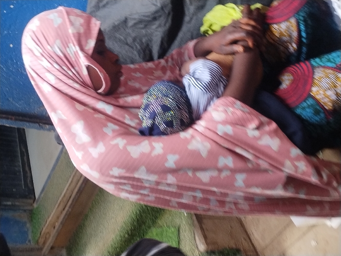A person wearing a pink butterfly-patterned hijab is seated, with dark skin and an obscured facial profile. They are holding a child, whose head is covered in a dark blue beaded cap. The child is also wrapped in a striped shirt. Next to them is a colorful piece of patterned fabric, likely clothing. The background is slightly blurred. The setting appears to be outdoors, with a glimpse of artificial grass.