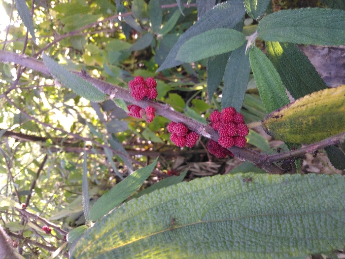 The image displays a close-up of a plant situated within a vegetated area in Ban Naduan, Laos. Multiple clusters of small, spherical, deep red fruits are attached directly to a brown woody stem. Surrounding the stem are green, textured leaves with prominent venation; one leaf positioned at the lower right exhibits a yellowing discoloration. Several small, dark-colored ants are observed on a large green leaf to the left of the main stem. The background consists of out-of-focus green foliage and tree branches, indicating a dense natural environment, illuminated by natural daylight filtering through the canopy.