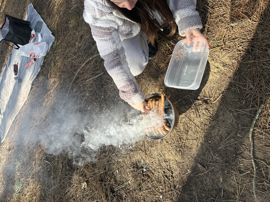 The scene, located in Novo Oriahovo, Bulgaria, depicts an individual squatting on dry ground extensively covered with brown pine needles and small twigs. The person wears a grey and white patterned fleece hooded jacket and grey trousers. Their left hand operates metal tongs, turning approximately seven to nine sausages cooking on a small, round, charcoal grill from which a dense plume of white smoke ascends. The individual's right hand holds a clear, rectangular plastic container with a lid. In the background, a light grey blanket is spread on the ground, holding a black insulated tote bag, a white plastic shopping bag, a small dish with white residue, a red cylindrical object, and a small red and black object. The area is illuminated by natural sunlight, casting shadows on the ground.