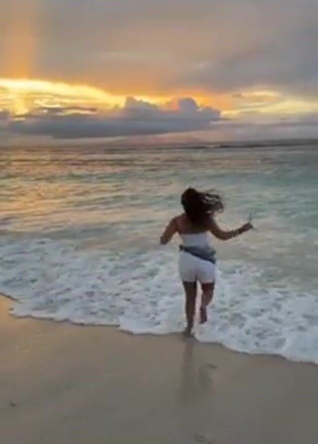 A woman runs barefoot into the ocean at sunset. She's wearing a white top, white shorts, and a gray waist pack. The sky is cloudy with bright orange light breaking through near the horizon. The waves are small and foamy as they break on the sandy beach. The camera follows the woman as she wades further into the water, spreading her arms.