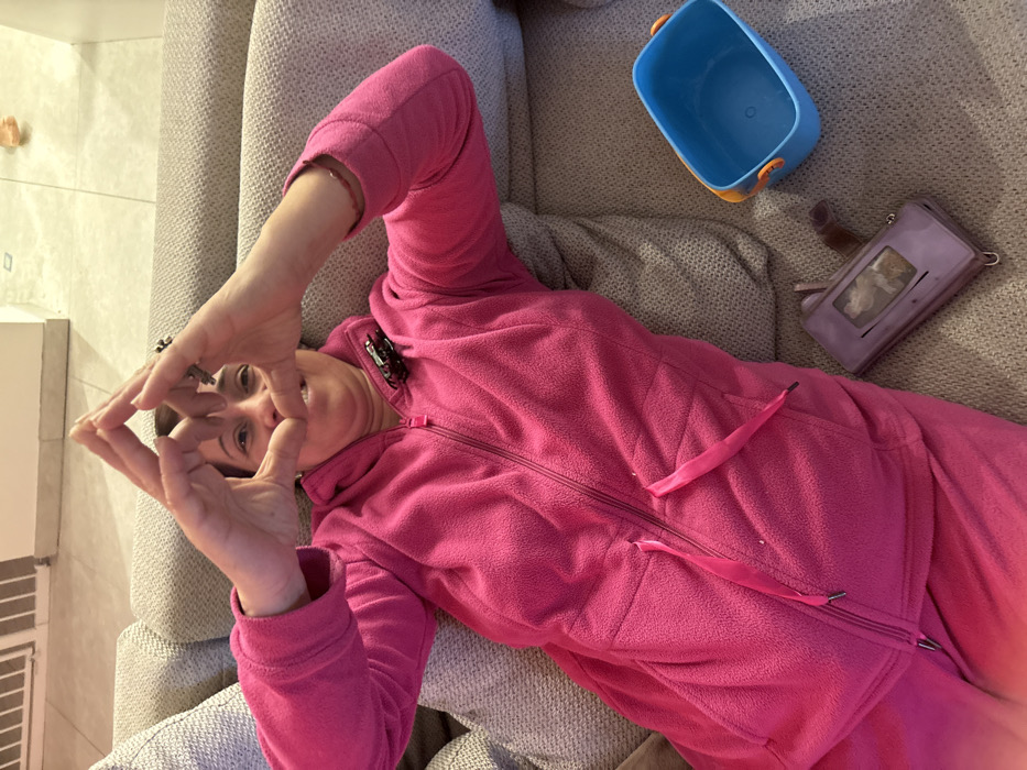 A woman in a bright pink fleece suit reclines on a grey couch, making a triangle with her hands in front of her face