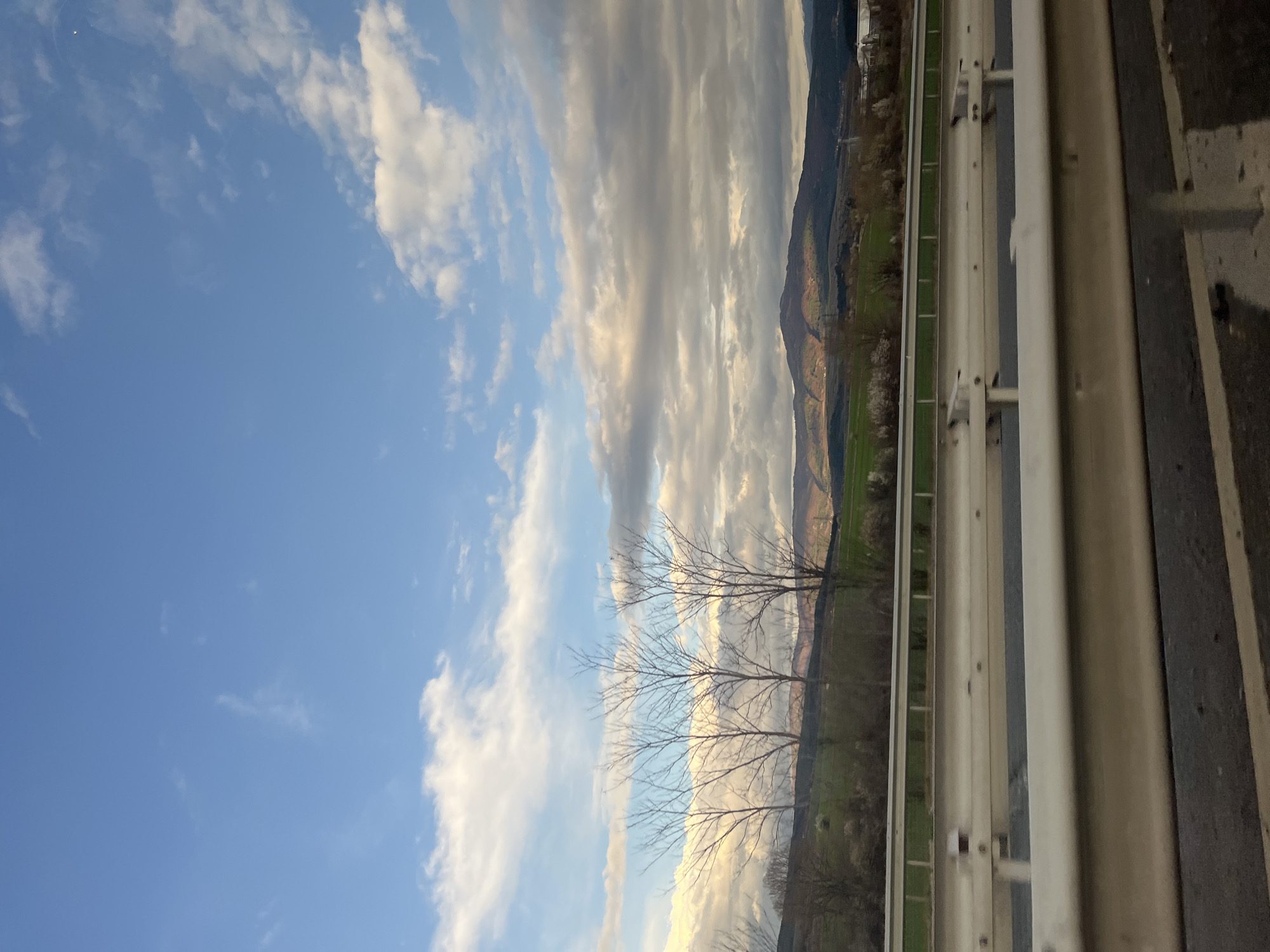 The image depicts a view from a vehicle traveling along a road, possibly a highway or freeway. The scene is oriented sideways. The sky is visible on the left, displaying a gradient from blue to white with scattered clouds. Adjacent to the sky is a landscape featuring rolling green fields, trees, and a distant mountain range. In the foreground, a metal safety barrier or guardrail runs along the right edge, obscuring part of the view. The road surface is also visible. Based on the location provided, the scene is likely in or around Dolna Dikanya, Bulgaria, although there are no elements in the image that explicitly confirm the location. There are no people visible in the image. The time of day appears to be late afternoon or early morning based on the light in the sky.