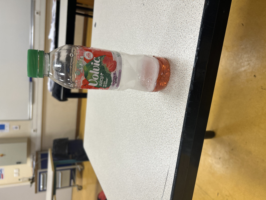 - "A partially consumed 50cl Volvic Juicy "Au jus de fraise" (strawberry juice) drink bottle with a green screw cap rests upright on a speckled white tabletop within a classroom in Strasbourg, France" by FM-Y7fkh1, licensed under CC BY 4.0