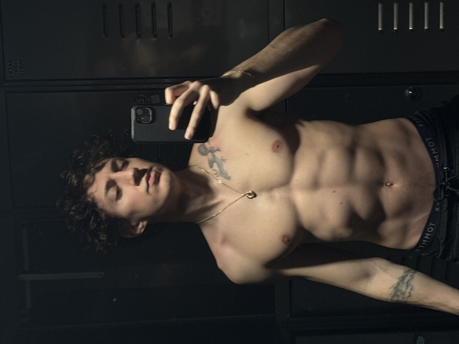 A young, shirtless male with curly dark hair is depicted in a mirror selfie