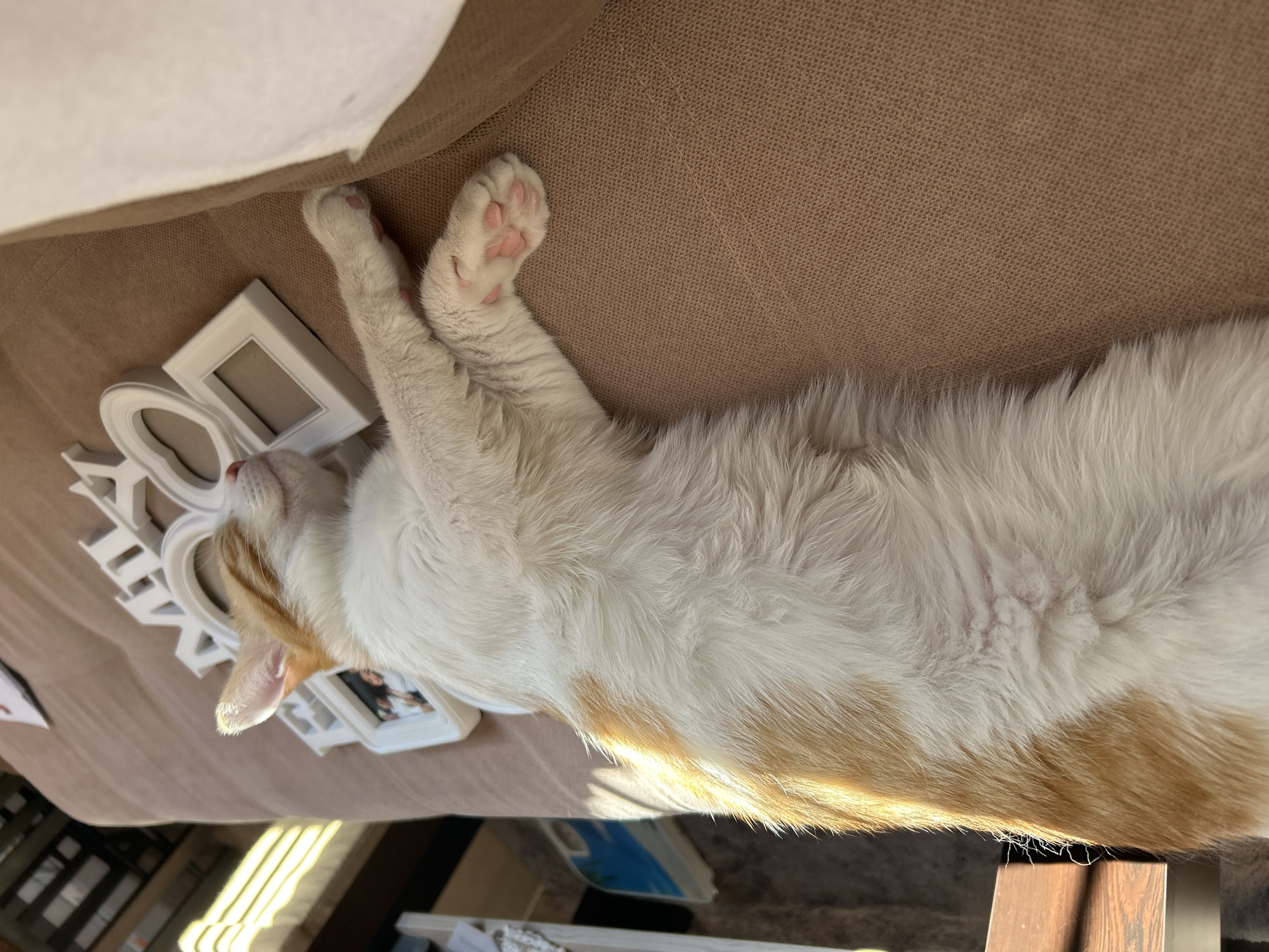 A cat, primarily white with orange patches, is stretched out asleep on a brown surface. It lies next to white picture frames spelling out the word "HOME". The cat's pink toe beans are visible on one outstretched paw. The surface appears to be a couch. Natural light illuminates the scene.